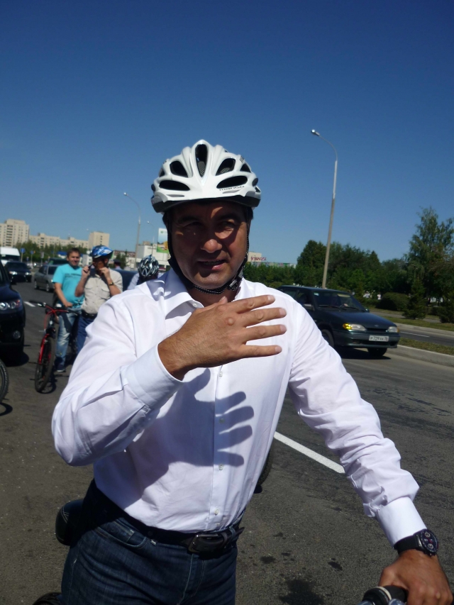 Приемка отремонтированного Автозаводского проспекта прошла в трациционной форме: руководство города садится на велосипеды во главе с Василем Шайхразиевым и смотрит, не расплескается ли во время езды вода в стакане, установленном на багажнике велосипеда градоначальника.