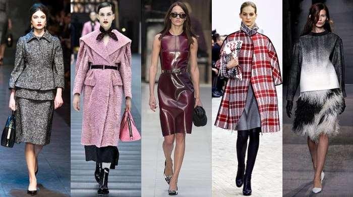 И конечно же, одежда из натуральной кожи, как матовой, так и лакированной: платья, юбки, топы, жилеты и даже свитера. Предпочтение отдается практичной и элегантной черной коже за её совместимость со всеми видами ткани или одежды. Сочетание одежды из кожи и декора из меха — еще одна тенденция 2014 года. Главный мех нынешнего зимнего сезона - каракульча.