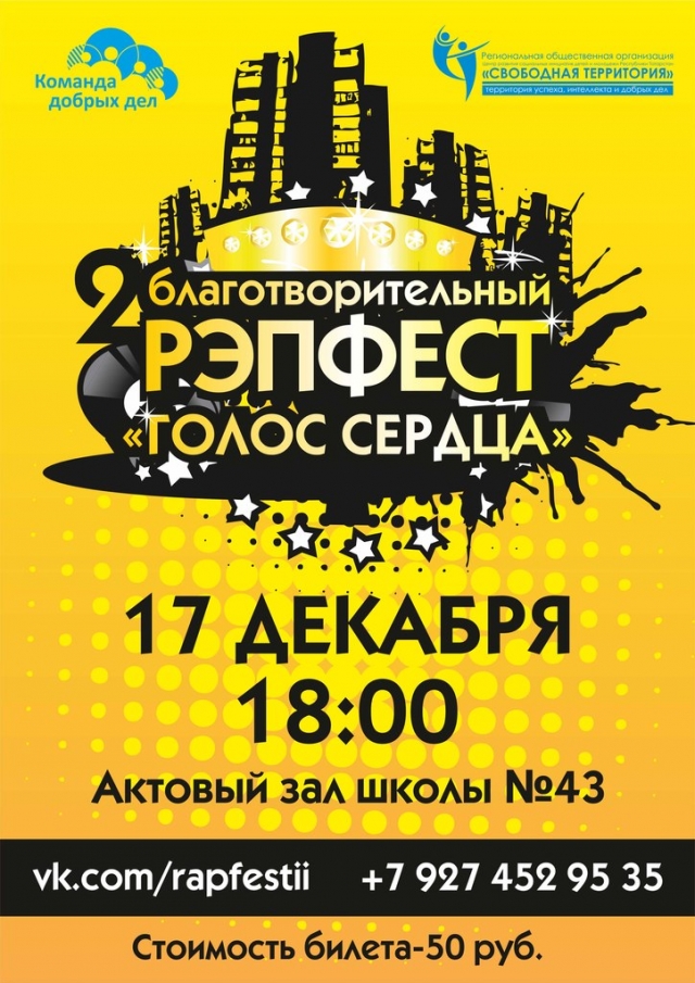 17 декабря в Набережных Челнах готовится проведение благотворительного рэп-фестиваля "Голос сердца", на котором будут выступать молодые исполнители хип-хопа. Он пройдет в 18-00 в актовом зале школы № 43. Конкретного адресата, которому перечислят средства от продажи билетов, объявят на самом мероприятии.