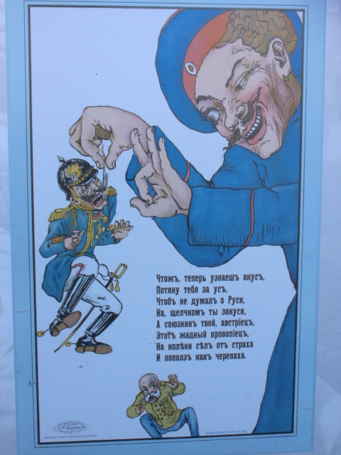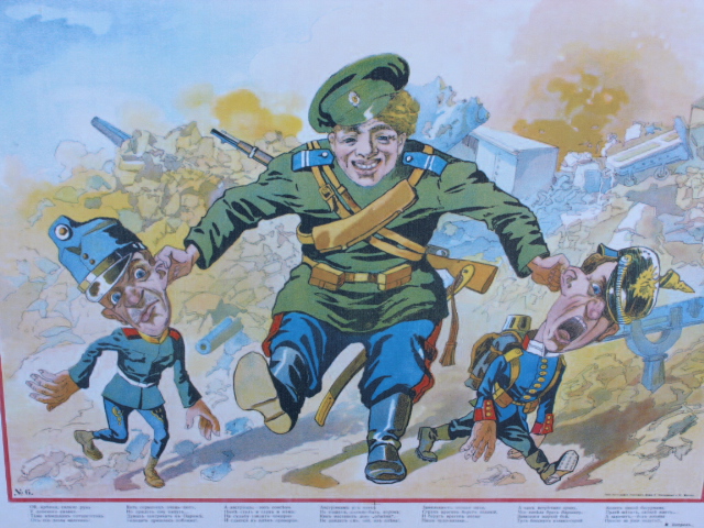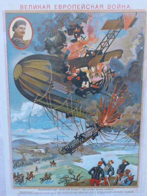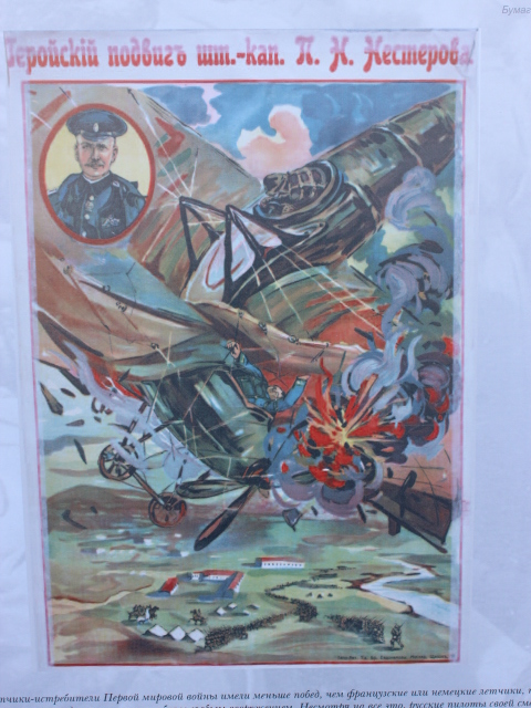 Многие плакаты, посвящены подвигам русских солдат и союзников по Антанте. Например, подвигу штабс-капитана Петра Николаевича Нестерова, совершившего 8 сентября 1914 года первый в истории авиации воздушный таран. Ценой собственной жизни он сбил вражеский аэроплан.