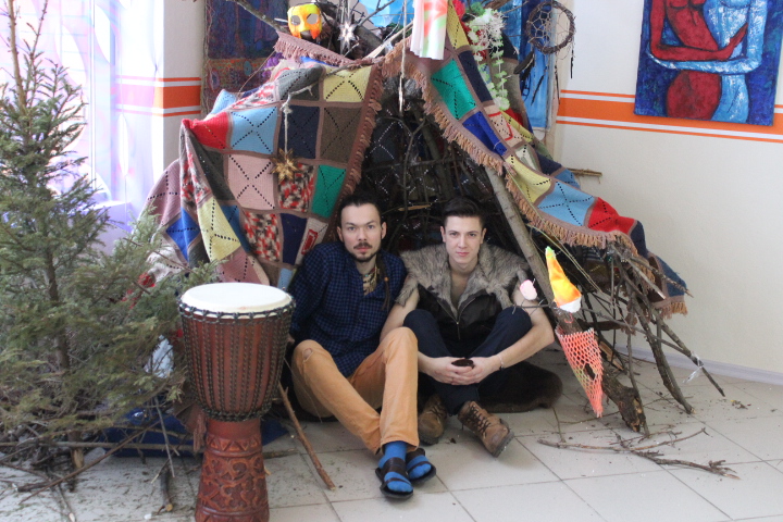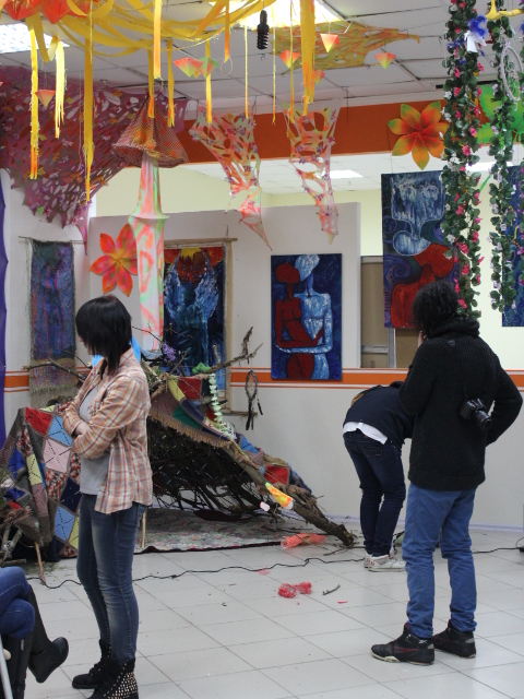 Набережные Челны, новости культуры: Сегодня завершилась уникальная выставка-марафон «Театратта Санты Джексона». Начиная с пятницы выставка работала круглосуточно. Организаторы ночевали прямо на территории магазина «Мэлт», где все и происходило. В центре зала возвышалось большое цветастое дерево из картонной трубы — совместная инсталляция организаторов и гостей выставки. В углу был установлен индейский вигвам, где можно было попить чай или просто отдохнуть от суеты и шума. А шума и хаотичности было много — где-то играли в пинг-понг, а рядом, к примеру, читали лекцию про сербскую художницу Марию Абрамович или декламировали стихи. За три дня выставку посетило несколько сотен человек.