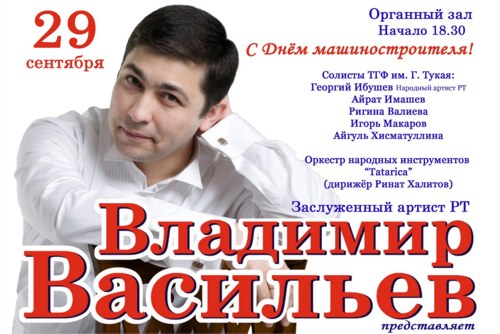 29 сентября воскресенье | 18.30 | С Днём машиностроителей! | Солисты Татарской государственной филармонии: Владимир Васильев, Георгий Ибушев, Айрат Имашев, Ригина Валиева и другие, в сопровождении оркестра народных инструментов «ТАТАРИКА» |