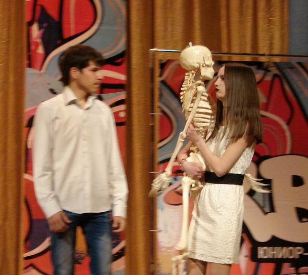 Отдельного внимания заслуживает персонаж девочки-гота из «Компота». Прямо, как в песне поется — «Намазав губы гуталином... выхожу на променад. И звезды светят мне красиво, и симпатичен ад». Немного черного, но очень уместного, а главное понятного и смешного юмора — и команда из 34-й школы становится победителем игр прошедшего сезона.