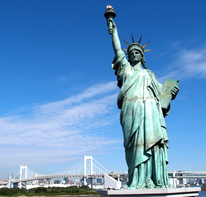 * В 1886 году состоялось официальное открытие статуи Свободы в Нью-Йорке. Создать статую было поручено французскому скульптору Фредерику Огюсту Бартольди. Задумывалась она как подарок американскому народу к столетнему юбилею Декларации Независимости. По одной из версий, у Бартольди даже была французская натурщица: красивая, недавно овдовевшая Изабелла Бойер, жена Исаака Зингера, создателя и предпринимателя в области швейных машин. «Она освободилась от неловкого присутствия её мужа, который оставил её лишь с самыми предпочтительными в обществе атрибутами: состоянием и детьми. Будучи красивой французской вдовой американского предпринимателя, она оказалась подходящей моделью для статуи Свободы Бартольди». Статуя держит факел в правой руке и скрижаль в левой. Надпись на скрижали гласит «JULY IV MDCCLXXVI» (написанная римскими цифрами дата «4 июля 1776» - день принятия Декларации независимости США). Общий вес меди, использованной для отлива статуи — 31 тонна, а общий вес её стальной конструкции — 125 тонн. Общий вес бетонного основания — 27 тысяч тонн. Высота от земли до кончика факела — 93 метра, включая основание и пьедестал. Высота самой статуи, от верха пьедестала до факела — 46 метров.