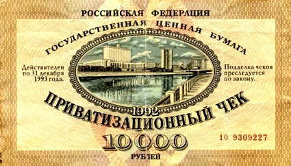 * В 1992 году в России началась выдача приватизационых сертификатов — ваучеров (от английского voucher — "расписка", "поручительство"). В процессе приватизации в России ваучер предоставлял право её владельцу приобретать взамен сертификата приватизируемую государственную и муниципальную собственность. Приватизация часто подвергается резкой критике. Утверждается, что новые обладатели собственности получили её не по заслугам, а за счёт личных связей и неформальных отношений с первыми лицами государства и их родственниками. С приватизацией связывают появление в России олигархов.