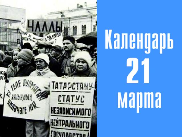 * В 1992 году в Татарстане прошёл референдум о статусе республики. На вопрос: "Согласны ли Вы, что Республика Татарстан - суверенное государство, субъект международного права, строящее свои отношения с Российской Федерацией и другими республиками, государствами на основе равноправных договоров?" ответили положительно 61,4% проголосовавших. Российская власть, зная о намерениях правящей элиты Татарстана, попыталась противостоять проведению референдума. 13-го марта 1992 года Конституционный суд РФ признал не соответствующим Конституции РФ постановление Верховного Совета РТ о проведении референдума.