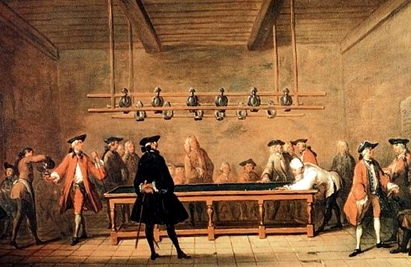 * В 1722 году в газете «New England Courant» впервые была упомянута игра бильярд (от французского billard, где bille - "шар" и billette - "палка"). Сегодня невозможно точно установить время появления бильярдной игры. Известно лишь, что она очень древнего происхождения; по утверждению одних ее родиной является Индия, по мнению других — Китай. В Россию бильярд был завезен из Голландии императором Петром I и быстро завоевал популярность. Обучение игре на бильярде было включено Верховным тайным советом в курс наук Петра II. А Екатерина II своим указом приказала в трактирах и на постоялых дворах «для увеселения приходящих дозволить иметь биллиарды». На рубеже XVIII и XIX веков бильярд являлся частью «обязательной» программы воспитания дворян в Европе и в России. Так, например, у Пушкина в Михайловском был бильярдный стол. И поэт, по воспоминаниям друзей, орудовал кием на сукне вполне профессионально.