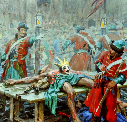 * В 1606 году в Москве в ходе антипольского восстания был убит Лжедмитрий I. Более 1700 поляков из окружения молодого царя было перебито; остальных, избитых и ограбленных, выслали из столицы. Москвичи надругались на телом убиенного царя, подвергнув его «Торговой казни». В первый день тело Лжедмитрия I пролежало в грязи посреди рынка. Во второй его перенесли на прилавок, вложив ему в рот дудку и положив в распоротый живот маску, которую самопровозглашенный царь готовил для придворного карнавала. А на третий день тело измазали песком, дегтем и «всякой мерзостью» и похоронили в «убогом доме» - на кладбище для упившихся за Серпуховскими воротами. Но и этого оказалось москвичам недостаточным. Позже труп выкопали, сожгли и, смешав пепел с порохом, выстрелили из пушки в сторону Польши - туда, откуда Лжедмитрий I явился.
