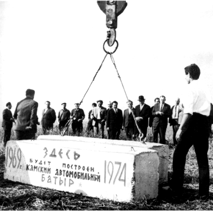 * В 1969 году экскаваторщик Михаил Носков вырыл первый ковш земли на промышленной площадке будущего Камского автомобильного завода - "КАМАЗ". Строительно-монтажные работы начались в феврале 1970 года с укладки фундамента первого завода — Ремонтно-инструментального. К концу года были также возведены корпуса серого и ковкого чугуна Литейного завода. За 11 лет в строительство было вложено 4,2 млрд рублей и введено производственных фондов на сумму 3,9 млрд рублей. В ударной комсомольской стройке участвовали более 700 иностранных фирм из 19 стран мира. "КАМАЗ" обслуживало около 2000 заводов по всему Советскому союзу. Первый грузовик "КАМАЗ-5320" сошёл с конвейера 16 февраля 1976 года. Его конструкция была разработана Московским автомобильным заводом имени И.А. Лихачева на основе семейства автомобилей "ЗИЛ-170" (6x4) и "ЗИЛ-175" (4x2). Параллельно возводился и Новый город Набережных Челнов - первая 12-тиэтажка была сдана в 1971 году. В город ежегодно приезжало до 40 тысяч человек.