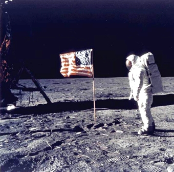 * В 1969 году американский космический корабль «Аполлон-11» совершил первую в истории посадку на Луну. Астронавты оставались на поверхности Луны в течение 21 часа 36 минут и 21 секунды. Всё это время пилот командного модуля Майкл Коллинз ожидал их на окололунной орбите. Астронавты совершили один выход на лунную поверхность, который продолжался 2 часа 31 минуту 40 секунд. Первым человеком, ступившим на Луну, стал Нил Армстронг. Через 15 минут к нему присоединился Эдвин Олдрин. Астронавты установили в месте посадки флаг США, разместили комплект научных приборов и собрали 21,55 кг образцов лунного грунта, которые были доставлены на Землю.