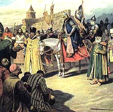 * В 1552 году произошло взятие войсками Ивана Грозного Казани и присоединения Казанского ханства к России. Всего Иван IV возглавил три похода на Казань. Первый поход (зима 1547-1548 гг.) закончился ничем, так как из-за ранней оттепели в 15 верстах от Нижнего Новгорода под лёд на Волге ушла осадная артиллерия и часть войска. В результате на штурм Казанского кремля без осадной артиллерии русское войско не решилось и, простояв под стенами семь дней, отступило. Во второй поход (осень 1549 — весна 1550 гг.) вновь не удалось взять Казань. Однако при отходе русского войска недалеко от Казани, при впадении в Волгу реки Свияги было решено возвести крепость, получившую название Свияжск; она послужила опорным пунктом для русского войска во время следующего похода. Третий поход (июнь—октябрь 1552 года) завершился взятием Казани. В походе участвовало 150-тысячное русское войско, вооружение включало 150 пушек. Казанский кремль был взят штурмом, а хан Едигер-Магмет был захвачен в плен.