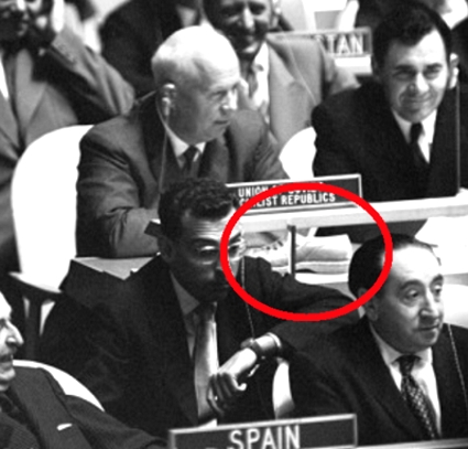 * В 1960 году на 15-й ассамблее ООН Хрущёв стучал ботинком по трибуне. В тот день шло обсуждение «венгерского вопроса» (вооружённое восстание против просоветского режима в Венгрии в октябре-ноябре 1956 года, подавленое советскими войсками.), и Хрущёв, вместе с другими членами советской делегации, всячески пытался его сорвать. По свидетельствам современников Хрущёва, Анастаса Микояна и личного переводчика Хрущёва Виктора Суходрева, дело происходило следующим образом: у Хрущёва был не ботинок, а открытые туфли (наподобие современных сандалий). Во время выступления докладчика Хрущёв снял туфлю и принялся нарочито долго её рассматривать и трясти, подняв на уровне головы, а также несколько раз слегка стукнул ею по столу, как бы пытаясь выбить камешек, который, якобы, туда закатился. Этими действиями Хрущёв демонстрировал, что доклад ему не интересен. Фотограф журнала Life Джон Лонгард, присутствовавший на том заседании,утверждает, что Хрущёв «точно не стучал по столу туфлей», хотя и «безусловно, собирался это сделать». По его рассказу, Хрущёв снял туфлю, положил её на стол и показал свободной рукой, что собирается стукнуть ей по столу. Все журналисты в зале направили камеры на Хрущёва в ожидании его дальнейших действий, но он лишь надел туфлю на ногу и ушёл. По мнению Лонгарда, если бы Хрущёв действительно стучал туфлей по столу, то никто из фотографов не упустил бы этого события. Аналогичное свидетельство даёт журналист газеты "Нью-Йорк Таймс" Джеймс Ферон. Любопытно, что на том же заседании Хрущёв назвал филиппинского докладчика «холуём американского империализма», поставив в тупик переводчиков.