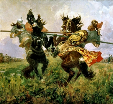 * В 1380 году на Куликовом поле состоялась победа русских войск, возглавляемых князем московским и владимирским Дмитрием Ивановичем, над ордынским войском под началом хана Мамая. Сражение началась с поединка русского воина инока Пересвета с монгольским богатырем Челубеем, в котором погибли оба. Далее разгорелась затяжная ожесточенная битва. Летописцы указывали, что кони уже не могли не ступать по трупам, так как не было чистого места. Лично князь Дмитрий Иванович сражался в первых рядах своих войск. Враг не выдержал напора и стал отходить, а затем пустился в бегство. Засадный полк преследовал супостата до реки Красивой Мечи 50 вёрст, «избив» их «бесчисленное множество». Войско Мамая было полностью разгромлено. Куликовская битва хотя и не привела к ликвидации татаро-монгольского ига на Руси, однако, на Куликовом поле был нанесен сильнейший удар по господству Золотой Орды, ускоривший ее последующий распад.