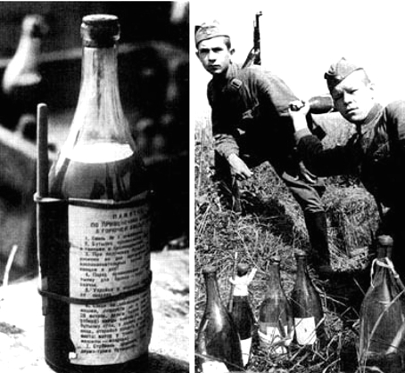 * В 1940 году финские военнослужащие, пытаясь противостоять советским танкам, начали массово применять бутылки с зажигательной смесью, которые позже получат название «Коктейль Молотова». Произошло название от имени председателя Совнаркома и министра иностранных дел СССР В.М. Молотова, который в одном из своих радиовыступлений заявил, что советские бомбардировщики не сбрасывают бомбы (а Хельсинки тогда подвергался постоянным бомбардировкам советской авиации), а доставляют продовольствие голодающим финнам. Финны после этого стали называть советскую кассетную авиационную бомбу РРАБ-3 «Хлебной корзиной Молотова», амалогабаритные авиабомбы — «Хлебницами Молотова». По аналогии свои бутылки с зажигательной смесью (polttopullo — «зажигательная бутылка») финны стали называть «коктейлем для Молотова».