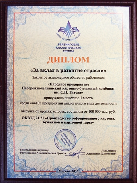 Независимая национальная компания "Рейтинговая Аналитическая Группа" по итогам анализа деятельности предприятий России присудила первое место "Набережночелнинскому картонно-бумажному комбинату им. С.П. Титова" среди 4410 предприятий, занимающихся производством картонной и бумажной тары.