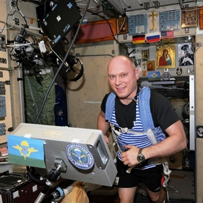 Этот кадр, на котором запечатлена беговая тренировка на борту Международной космической станции, вызвал интерес к репродукциям икон, размещенным на стене МКС