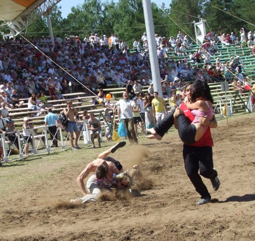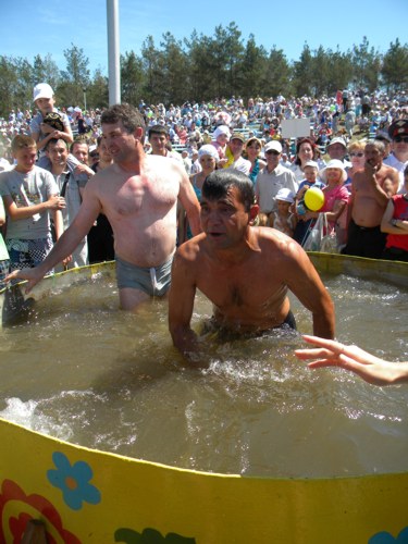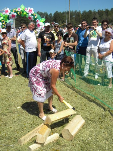 В этом году челнинцам приготовили три совершенно новых конкурса: переноска женщин, метание пней и заготовка дров. Эффектные, в основном мужские развлечения приятно разбавили традиционное "игровое меню" Сабантуя. При желании можно было уйти с сумкой призов: хочешь по столбу ходи, хочешь - рыбу в мутной воде лови. Многое из того, что проводилось для взрослых, существовало и в "беби"- варианте: стоблы для лазанья и битья мешками. Детские конкурсы пользовались, как обычно, огромным успехом.