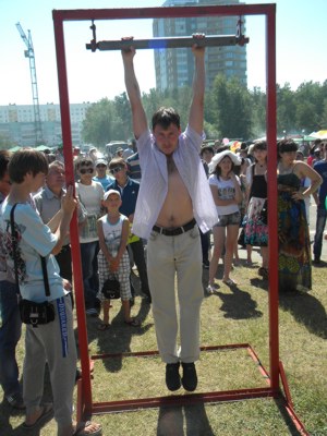 Наряду с шариками, шашлыком, фото с обезьянкой и временными тату гостям Сабантуя предлагался оригинальный спортивный "тотализатор". Вносишь владельцу "турника" 100 рублей, и если сумеешь провисеть на перекладине 65 секунд (женщинам 30) - получишь 500. Вроде бы минута и 5 секунд - совсем немного, однако бизнес очевидно прибылен.