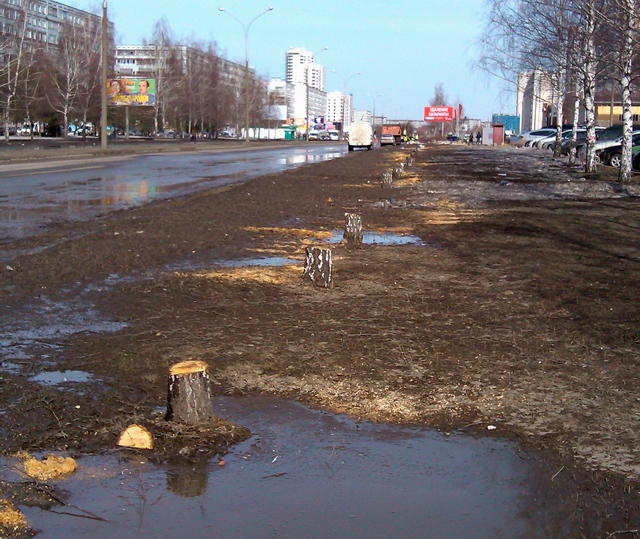 Вдоль проспекта Сююмбике со стороны 11-го комплекса сегодня вырубают деревья. "Мы вообще-то от улицы Королева идем, сегодня уже закончим, до трамвайных путей осталось немного", - говорят рабочие Горзеленхоза, показывая в сторону остановки "16-й комплекс".