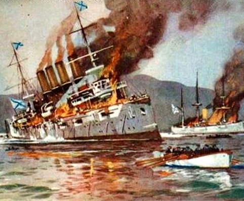 * В 1904 году в ходе русско-японской войны состоялось легендарное сражение крейсера «Варяг» и канонерской лодки «Кореец» с превосходящими силами японской эскадры. Русские корабли были пришвартованы в нейтральном корейском порту Чемульпо. Японская эскадра, состоящая из одного броненосного крейсера, пяти легких бронепалубных крейсеров и восьми миноносцев, блокировала порт и направила капитану «Варяга» Всеволоду Рудневу ультиматум: покинуть Чемульпо, иначе русские суда будут атакованы. Руднев решил с боем прорваться в Порт-Артур и в полдень «Варяг» с «Корейцем» вышли из порта. Французские и английские корабли, стоявшие на рейде, оркестром проводили идущий в бой «Варяг», а их капитаны отдали честь российским морякам. Через 10 миль Руднев вышел на японскую эскадру. Неравный морской бой длился около часа. «Варяг» выпустил по противнику 1105 снарядов, а «Кореец», вступивший из-за слабости своих орудий в бой только в конце сражения, — 52 снаряда. Атака русского крейсера была более чем успешна - был потоплен один японский миноносец и повреждены еще четыре вражеских крейсера. Однако сам «Варяг» получил пять подводных пробоин и лишился трех орудий. Были убиты один офицер и 30 матросов, более ста человек экипажа получили ранения. На «Корейце» потерь не было. "Варяг" больше не мог продолжать бой, а потому вернулся в Чемульпо. После оценки серьёзности повреждений было принято решение об уничтожении оставшихся орудий и затоплении крейсера путём открытия кингстонов. «Кореец» был взорван... Бой и гибель «Варяга», отвечающие канонам самурайской чести, весьма впечатлили японцев. После окончания войны японское правительство создало в Сеуле музей памяти героев «Варяга» и наградило Руднева орденом Восходящего солнца.
