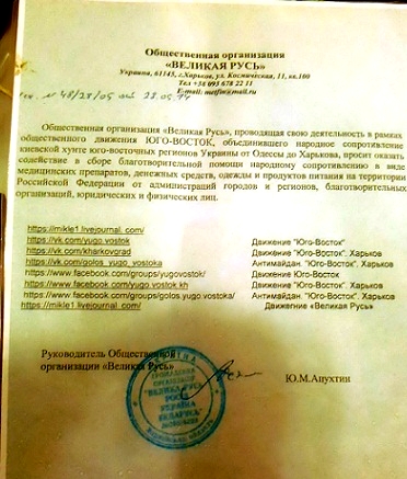 Я позвонил нашим координаторам - нужен мандат. Нас приняли в члены общественной организации "Великая Русь", которая, как многие другие общественные организации, выступающие за федерализацию, вошла в движение "Юго-Восток". Нам прислали мандат и письмо-обращение с просьбой оказать содействие в сборе гуманитарной помощи. Правда, это отсканированные документы, которые переслали по электронной почте. Проводники в поезде побоялись перевозить оригиналы.