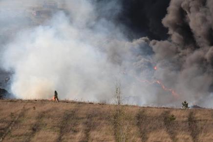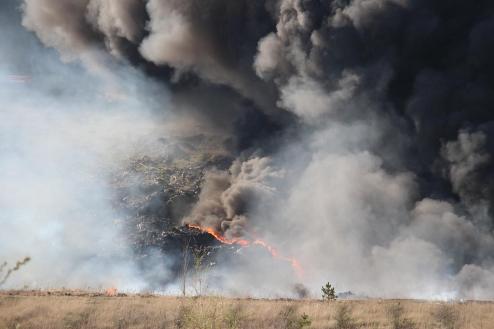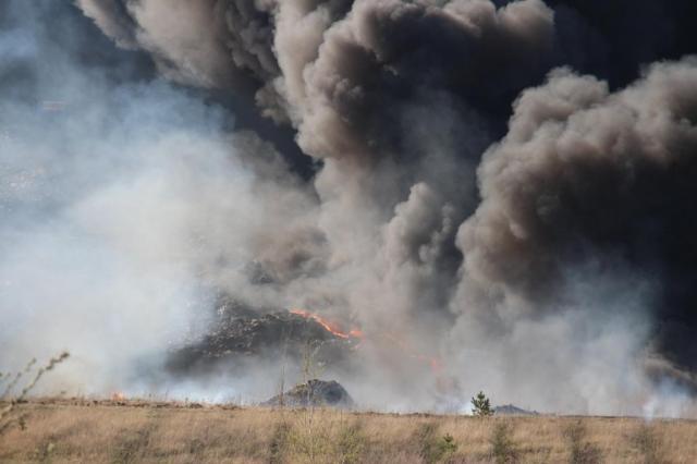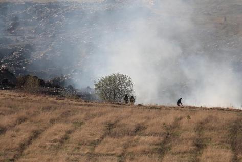 По словам наблюдателей, скопившихся на дороге перед горящей свалкой, пожар начался сегодня и его раздувает каждый порыв ветра. Пожарные несколько часов не могли подойти к многочисленным очагам возгорания из-за температуры и неровной поверхности свалки.