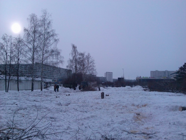 В спорах вокруг строительства культурно-выставочного центра у дома 17/03 в Новом городе окончательно поставлена точка. Пилой. Работники Горзеленхоза приступили к вырубке деревьев на месте будущего нового парка и культурно-выставочного центра.