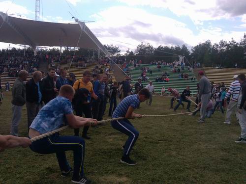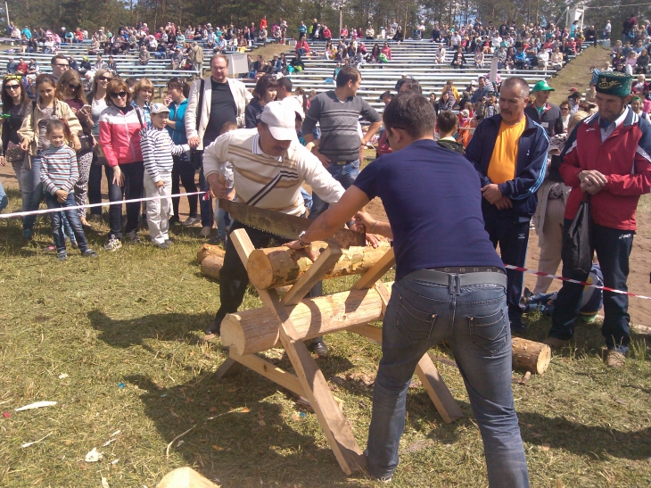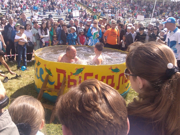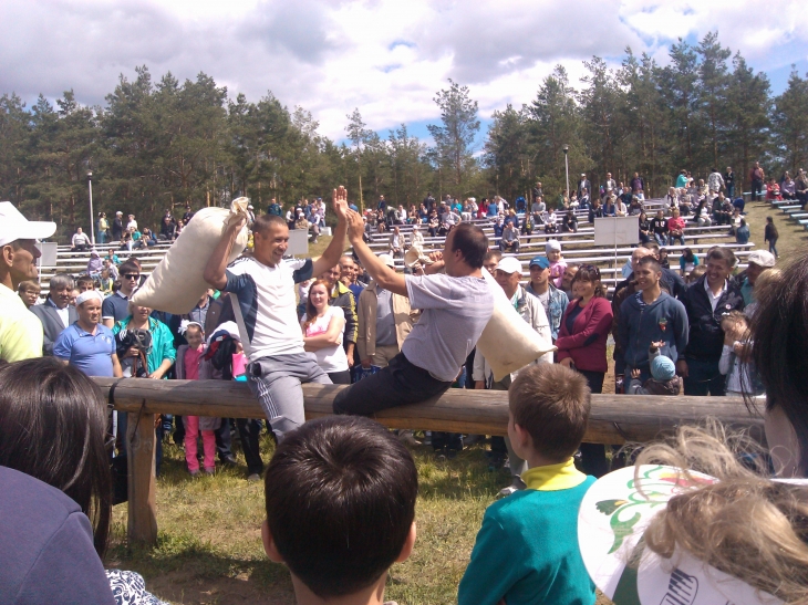 Сегодня на Сабантуе в Набережных Челнах бегали не только в мешках, но и в ластах! На время рубили дрова и пилили бревна. Ловили руками в воде живую рыбу. Сидя, держась за палку, перетягивали друг друга. Кто кого оторвал от земли, тот и выиграл. Метали на дальность бревна.Объявляли даже, что предлагается принять участие в пришедшем из Финляндии соревновании-развлечении, которое называется "нежный перенос женщины на руках". Берешь на руки жену или подругу и нежно несешь. Много желающих носить любимых женщин на руках не нашлось. Или не нашлось много женщин, которые захотели тратить время на то, чтобы их здесь носили. Женщины хотели сами соревноваться. Они носили ведра, перетягивали друг друга на палках, боролись на руках, бегали...