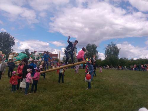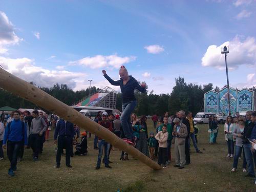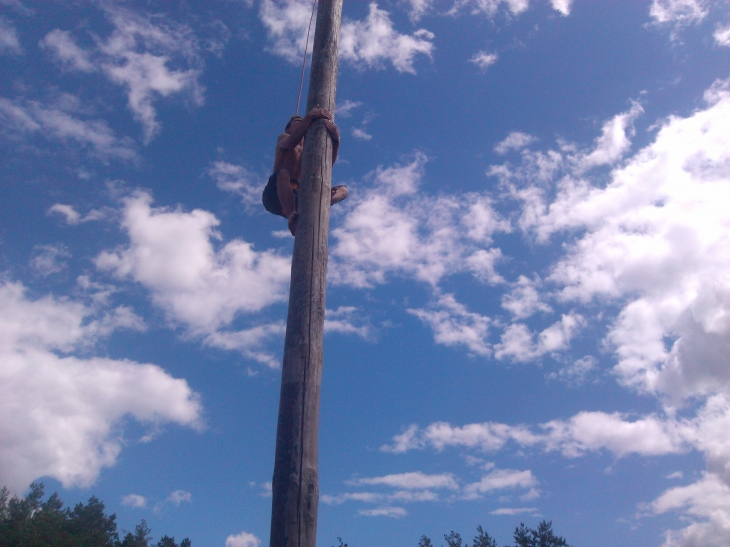 Огромной популярностью пользовалась ходьба по наклонному бревну. Народ стоял в длинной очереди. Было такое ощущение, что по наклонному бревну захотели пройти все, кто пришел на стадион Майдана. Ходили даже самые маленькие дети. Многие без обычной подстраховки, когда ребенка за руку держала мама или папа. Очень многие пытались забраться наверх по высоченному столбу. Были тут и свои мастера. Они по обезьяньи забирались на верхушку, а там еще демонстировали аккробатические номера. Садились на верхушку и приветствовали болельщиков. Зависали на самом верху вниз головой. Поворачивали тело параллельно земле.