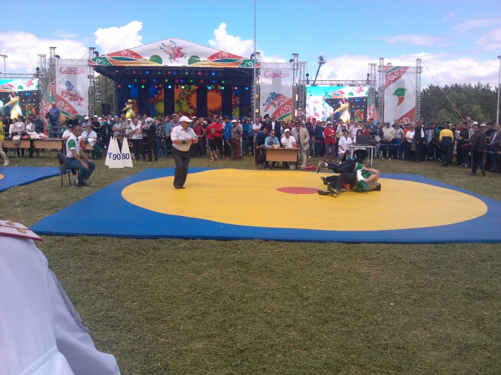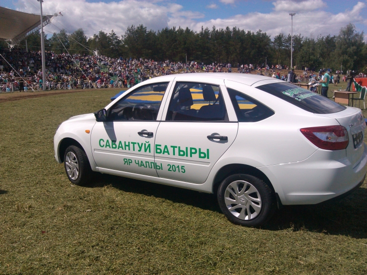 Увы, не всем дано быть борцом на поясах. И не каждому из борцов дано стать абсолютным батыром. В этот раз борьба за титул батыра Сабантуя, за главный приз (автомобиль "Лада-Гранта" и живого барана) шла остро и захватывающе. Интрига была в том, что на ковре опять сошлись прошлогодние соперники: Ринат Ахметшин и Ильдар Хамитов. Ринат - чемпион Универсиады, чемпион мира по борьбе курэш. Ильдар - просто мастер спорта по борьбе. В прошлом году главный приз Сабантуя Ринату он проиграл.