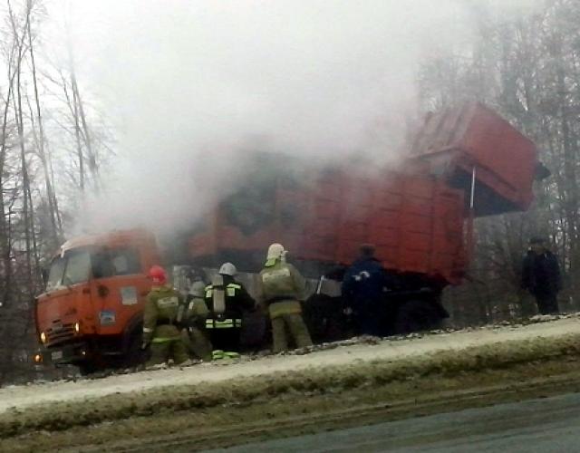 Сегодня днем на Мензелинском тракте во время движения загорелся набитый грузом мусоровоз «КАМАЗ», направлявшийся на свалку. В итоге контейнер был охвачен огнем, но кабина машины не пострадала.