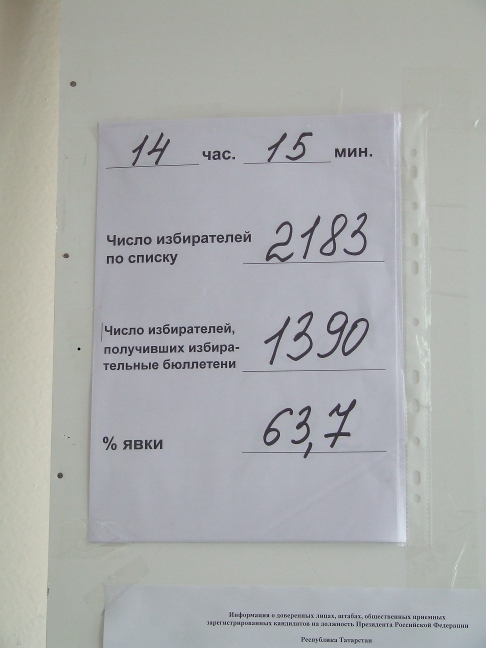 Что касается самого голосования, то нужно отметить, что челнинские избиратели были активны уже с утра. Избирательные участки открылись в 8.00. К 11.30 явка составила 33,08%, к 13.30 – 54,34%, к 14.30 – 62,2%, к 16.30 - 71.59%. Это в целом по городу. На некоторых участках цифры были еще выше. К примеру, на участке №2113 к 14.15 проголосовали уже 63,7% избирателей. Председатель комиссии на этом участке ответила нашему корреспонденту, что никаких нарушений не было. Это подтвердила и наблюдатель от КПРФ (остальных наблюдателей в этот момент в зале для голосования не было – они ушли сопровождать переносную урну).