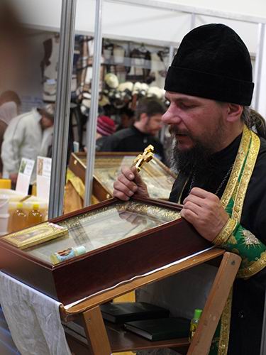 «Это типа амулетов?», - спрашивает женщина в годах. Ей терпеливо объясняют, что амулеты у некрещеных, а это ладанки. Другая женщина подходит к иконе «Неупиваемая чаша». Спрашивает у стоящей рядом монахини: «От алкоголя?». Получив положительный ответ, делится: «Сынок пьет». В надежде исцелиться, помочь близким, решить жилищные или другие проблемы подходят посетители к прилавкам с иконами, тетрадками, где записывают имена. Продавцы активно помогают определиться с выбором, зазывают: «приложитесь к Николаю-угоднику», «именные кирпичики», «кто делал аборты — отмаливаем грехи». Заказанные требы будут совершены в тех храмах и монастырях, которые представлены на выставке. Заказывая молебен о вразумлении детей или покупая елей «при тяжелый и раковых заболеваниях», люди с надеждой спрашивают, точно ли помогает, и сами себя уговаривают, что здесь уж не обманут.