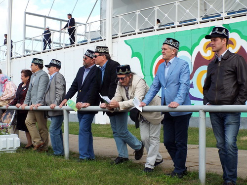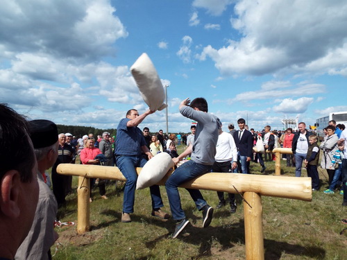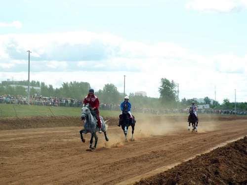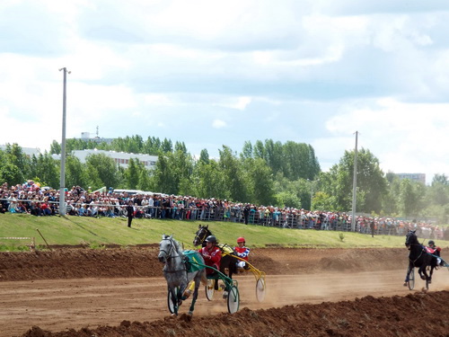 Второй площадкой проведения Сабантуя в Набережных Челнах стал ипподром. Здесь, в отличие от прежних лет, разместили небольшой майдан с местами для зрителей и с эстрадой, устроили площадки для битвы мешками, для разбивания горшков палками... Словом, Сабантуй в миниатюре.
