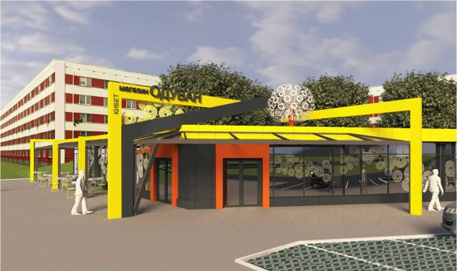 Если заказчик успеет получить разрешение на строительство (срок аренды земли у него заканчивается 23 апреля следующего года), то у дома 51/04 появится магазин и кафе под названием «Одуван». Здание будет одноэтажным, высотой 4 метра. Но расположено оно ниже жилого дома и так, что крыша «Одувана» будет находиться на уровне пола квартир первого этажа жилого дома. Есть парковка, с выходом на нее расположен дебаркадер магазина. Здание из сэндвич-панелей будет оформлено композитными панелями, остекление будет выполнено из фасадного каленого стекла.