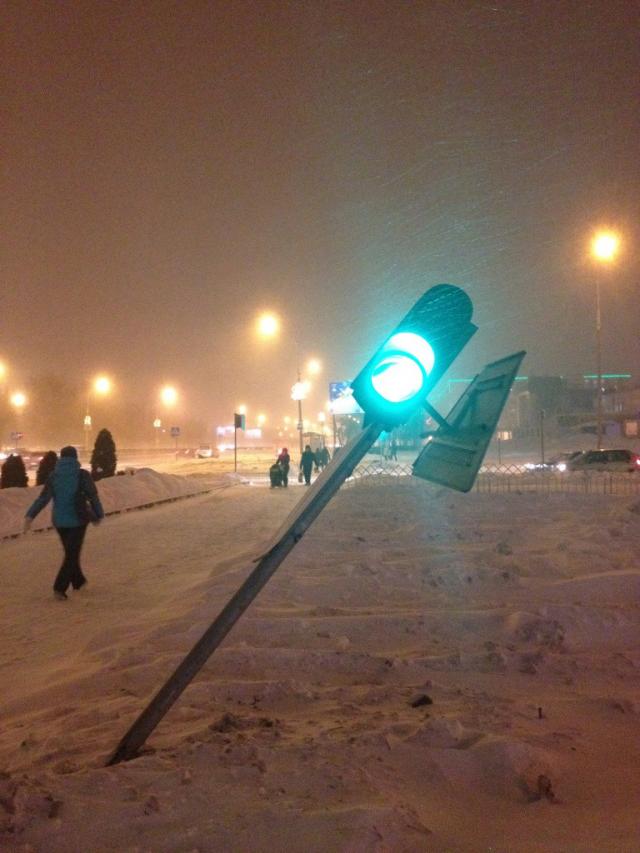 Неожиданную стойкость и волю к жизни показал во время ненастья пешеходный светофор на перекрестке проспектов "Мира - Автозаводский". Он работал, правильно различая цвета, даже в своем новом кривоватом состоянии.
