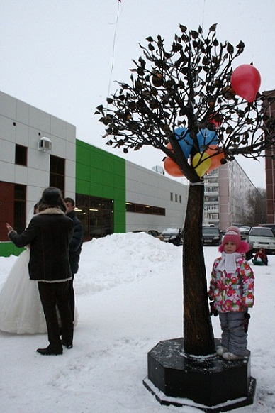 Свадебная традиция вешать замки любви в день бракосочетания появилась в России относительно недавно. К нам она пришла с Запада и успешно прижилась. Однако Набережные Челны невыгодно отличаются от своих городов-соседей тем, что у нас нет практически ни одного парка для влюбленных, куда молодожены могли бы приехать на прогулку после регистрации. Большая часть вновь испеченных семейных пар после церемонии обычно уезжают на прогулку в гостеприимные Елабугу и Нижнекамск, где есть живописные благоустроенные парки, красивые мосты и фонтаны. Пытаясь хоть как-то исправить ситуацию, инициативная группа челнинцев, которые называют себя "Энергия жизни", решили сделать доброе дело для родного города. Благодаря их стараниям на Боровецком бульваре появилось симпатичное кованое сооружение в виде дерева. Предполагается, что оно станет объектом паломничества для челнинских молодоженов и сможет выдержать около сотни замочков - символов крепких, как сталь, отношений. Это сооружение обошлось "Энергии жизни" в 200 тысяч рублей - деньги, признаются ребята, собирали всем миром. Автор романтического шедевра - елабужский художник Алмаз.