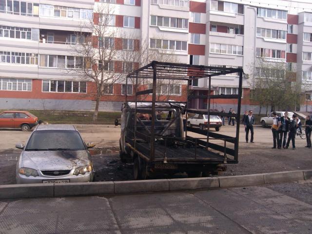 Возгорание произошло у автобусной остановки "25 комплекс". Как выяснилось, сначала запылала грузовая «Газель», которая в итоге практически полностью выгорела. Разбушевавшийся огонь перекинулся на стоявшую рядом иномарку. В результате этот автомобиль частично обгорел. Очевидцы сообщают, что слышали громкий хлопок. Вероятно, в «Газели» взорвался газовый баллон. МЧС позже сообщило о поджоге...