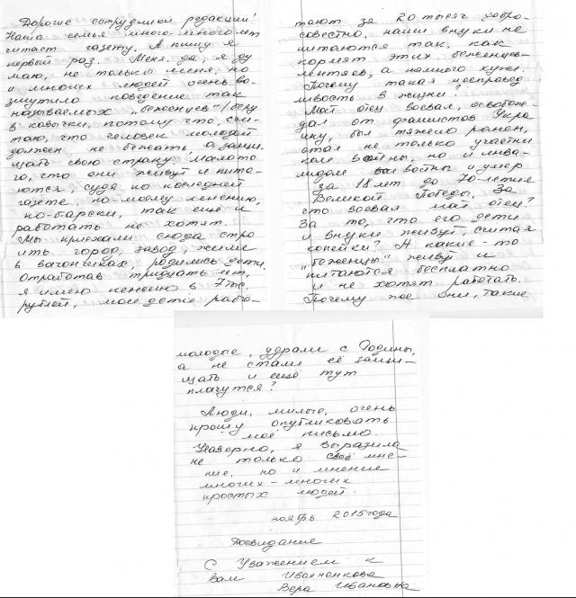 «Дорогие сотрудники редакции! Наша семья много - много лет читает газету. А пишу я первый раз. Меня, да, я думаю, не только меня, но и многих людей очень возмутило поведение так называемых "беженцев" (беру в кавычки). Потому что, считаю, что человек молодой должен не бежать, а защищать свою страну. Мало того, что они живут и питаются, судя по последней газете, по-моему мнению, по-барски, так ещё и работать не хотят.