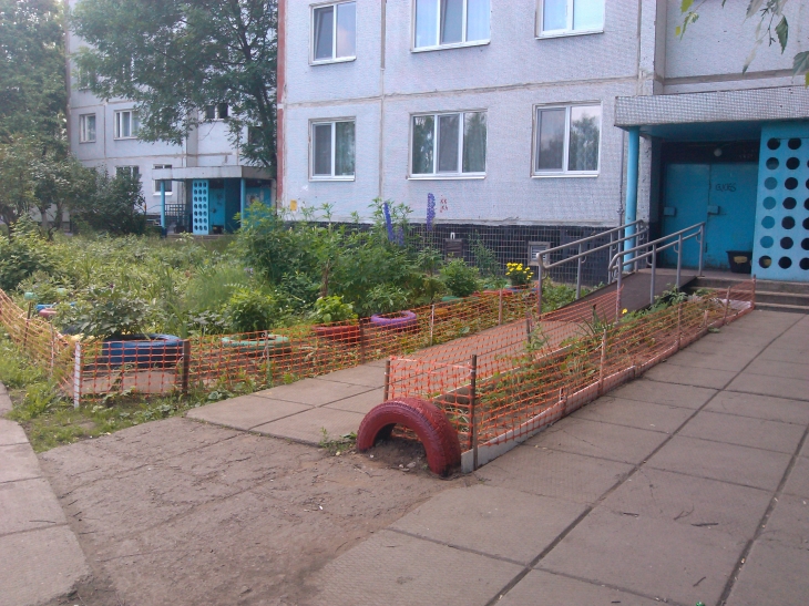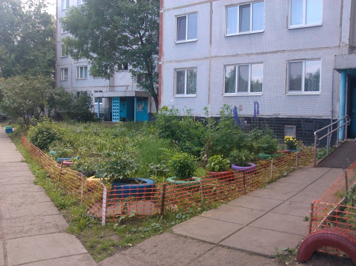 Житель этого дома в Набережных Челнах, бывший фрезеровщик ПРЗ, а ныне пенсионер Анатолий Дмитриевич Шаталов заразил соседей собственным примером. Однажды он решил сделать так, чтобы у его подъезда было красиво. Добился, чтобы ЖЭК выброшенные из подвала старые трубы пустил на ограждение вокруг того места, где должна быть клумба. Сам с соседями по подъезду доделал это ограждение вдоль газона. После чего жильцы этого подъезда стали украшать газон и клумбу цветами и деревьями.