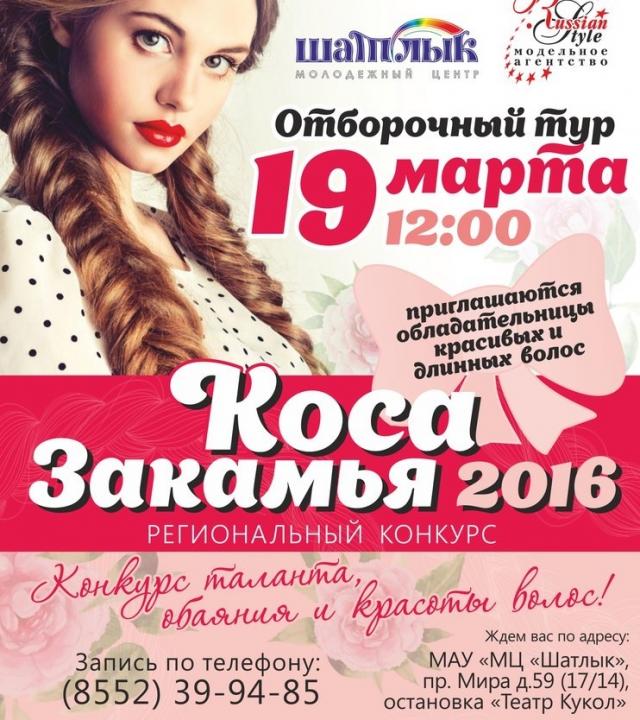 Конкурс таланта, обаяния и красоты «Коса – девичья краса» уже много лет собирает в Челнах красивых девочек и самых привлекательных девушек-обладательниц длинных, пышных и ухоженных волос. 19 марта 2016 года в 12 часов в молодёжном центре «Шатлык» состоится отборочный тур, на который приглашаются все длинноволосые красавицы в возрасте от 5 до 25 лет.