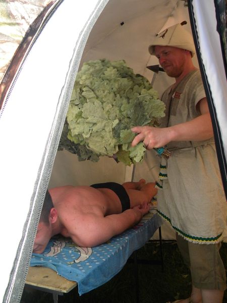 На подходе к сцене путь Василю Гаязовичу дружной шеренгой преградили члены организации «Волонтер», зазывая его посетить настоящую полевую баньку, которая расположилась на другой стороне бульвара. Посмотрев на часы, мэр все таки не удержался: «На больную мозоль давите — знаете, что попариться люблю! Ну пойдемте!» Подойдя к полевой бане, париться все же не стал, лишь с завистью оглядел баньку.