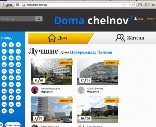 Должность №1 – мэра – кроме Василя Шайхразиева, заняли сразу несколько челнинцев. На недавно открывшимся сайте Domachelnov.ru они стали мэрами своих домов. Процедура выбора на виртуальную должность очень проста: необходимо выбрать свой дом, зарегистрироваться по адресу проживания первым, разместить фотографию и оставить какой-либо комментарий. Сейчас званием мэра обладают 33 челнинца, остальные 100 зарегистрированных пользователей выступают в качестве простых жителей. Самым лучшим домом на данный момент является дом, расположенный по адресу 36/8/1 (проспект Чулман, 21).