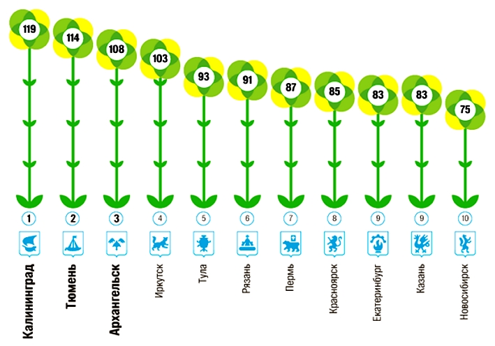 Санкт-Петербург занял 13 позицию (70 цветочных салонов), а Москва - на 33 месте (36 магазинов).