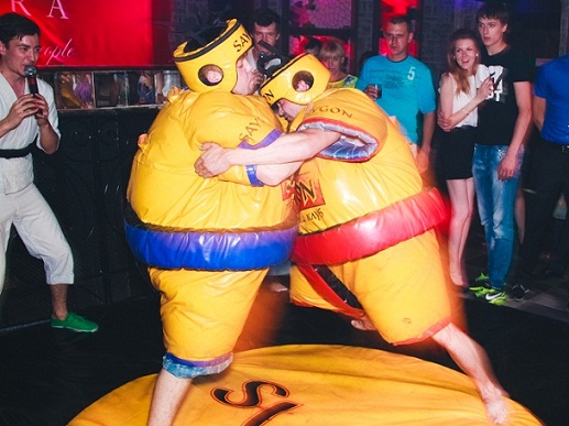 состоялось в ночь с субботы на воскресенье и первыми на татами танцпола вышли борцы сумо. Разумеется, все бои происходили в развлекательном клубном формате - специальный костюм "сумоиста" даже самых стройных превращает в неповоротливых увальней. Соревнования проходили по олимпийской системе - проигравший выбывает. Победитель получил 2 тысячи рублей, все остальные - бесплатные пригласительные на следующие вечеринки в клубе "Опера". Гостей развлекали девчонки из секси-гоу в образе гимнасток с атласными лентами и диджеи- резиденты клуба из Набережных Челнов.