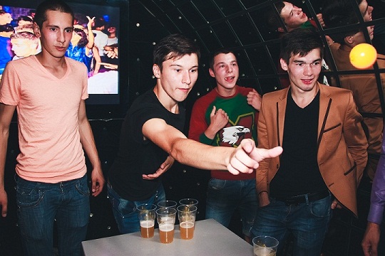 прошли в ночь открытия Универсиады в "Точке G" в рамках серии вечеринок "HOME PARTY стиле". Правда, со спортом их объединял только командный дух и желание выиграть. Правила командных развлечений в стиле подвыпивших американских менеджеров просты. В бир-понг надо забросить шарик для пинг-понга в один из пивных бокалов команды соперников, которые расположены на противоположной стороне стола. А в флип-кап тот, кто лихо выпив напиток из своей тары, смог легким движением руки поставить стоящий на самом краю бокал днищем вверх - тот и молодец, принесший очко для своей команды. Напоминает нашу русскую забаву школьников со спичечными коробками. Для того, чтобы выявить победителя, понадобился не один литр хмельной жидкости. К слову, для участников "забав по-американски" в Набережных Челнах было жесткое ограничение по возрасту - от 21 года.