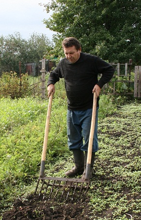 Зинфир Шарипов свой садовый инвентарь тоже сделал сам. Сейчас этот инструмент известен как картофелекопалка, но вариант «Sharipov» отличается от магазинного. Зубья сделаны из прочного металла и закалены: помогли знакомые на заводе. Вилы представляют собой планку с зубьями шириной в три лопаты. Чтобы при вскапывании земля откидывалась вперед, приспособлен упор. Также благодаря упору вилы можно вонзить в землю сразу всем весом, встав на него двумя ногами. Это очень удобно, если земля твердая. Черенков тоже два. Самодельные вилы намного шире. Ведь есть разница: один раз широко копнуть или три раза.