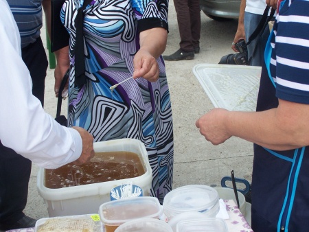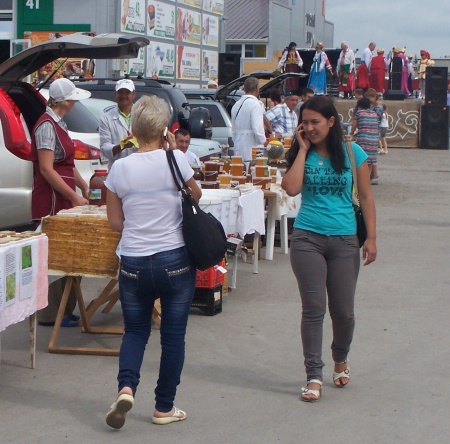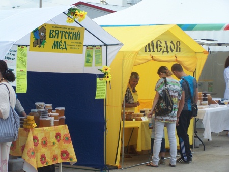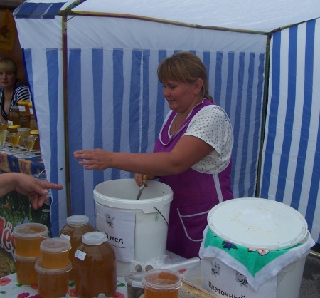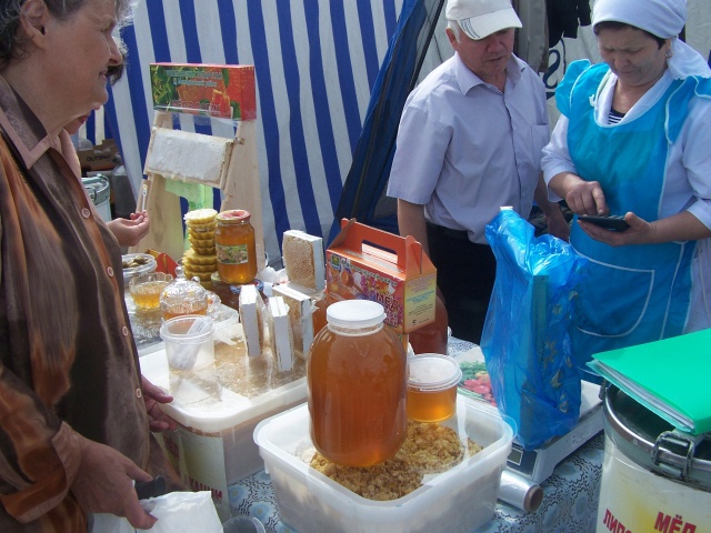 Мало кто из продавцов изначально указывает цену на прилавках, все готовы торговаться. Мамадышские пчеловоды предлагают 3 литра меда по 1200 рублей. И липовый, и цветочный. Фермеры из Башкирии просили сначала 1400, но готовы были снизить цену до 1300. Один из предпринимателей из Удмуртии готов был отдать 3-литровую банку «цветочного» за 1100 рублей.