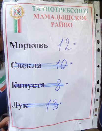 19 октября с 6 утра на улицу Усманова в Набережных Челнах начали подъезжать машины из 17 районов республики — на сельскохозяйственную ярмарку. Челнинцы, обрадовавшиеся торговле на привычном месте, начали расхватывать картошку и овощи. К 11 часам торговцы из некоторых районов вычеркнули ходовой и недорогой товар из ценников — его успели раскупить. К примеру, капусту по 8 рублей за килограмм разобрали, у тех же, кто продавал ее по 12 рублей, она продолжала лежать. Приблизительный расклад цен на ярмарке такой: картофель — 12-13 рублей за килограмм, свекла — 10, морковь — 12-13, лук — 13, говядина — 220, мед — 250, гуси — по тысяче рублей за тушку.