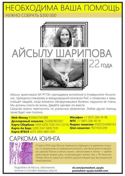 В ноябре 2013 22-летняя Айсылу Шарипова, в очередной раз почувствовав острую боль в бедре, отправилась в больницу. Там ей снова заявили: "воспалились лимфатические узлы", и выписали обезболивающие таблетки. Тем временем так называемый "лимфатический узел" рос, а боль усиливалась.